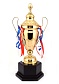 Кубок с металлической чашей, ножкой и крышкой на пластиковом постаменте. Ленточки из полиэстера украшают ручки кубка, но при необходимости их легко можно снять.