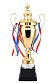 Кубок с металлической чашей, ножкой и крышкой на пластиковом постаменте. Ленточки из полиэстера украшают ручки кубка, но при необходимости их легко можно снять.