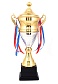 Кубок с металлической чашей, ножкой и крышкой на пластиковом постаменте. Ленточки из полиэстера украшают ручки кубка, но при необходимости их легко можно снять.