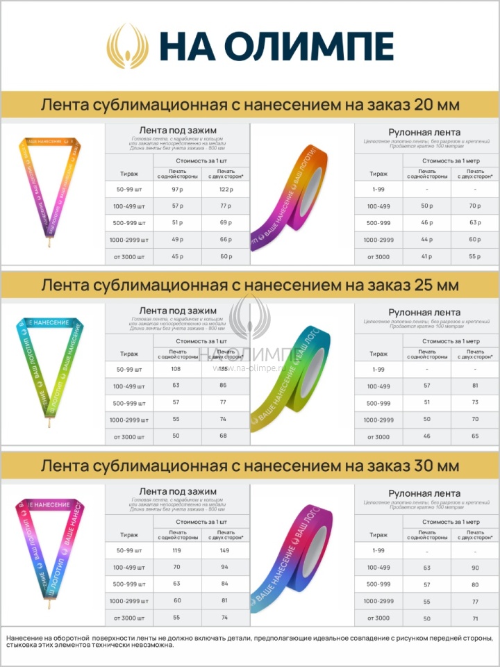 Лента для медалей софт тач, сублимационная с односторонней печатью. Подходит для медалей с прорезью, а также для медалей под карабин. Ширина ленты - 20 мм. Минимальный тираж от 50 штук. Также можно заказать ленту с печатью вашего дизайна в рулоне. Минимальный тираж в рулонах- от 100 метров.