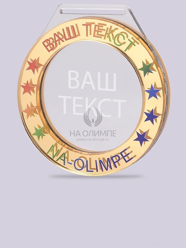 Медаль из акрила с гравировкой по центру и полноцветной печатью по кругу. Нанесение текста и логотипа уже включены в стоимость.