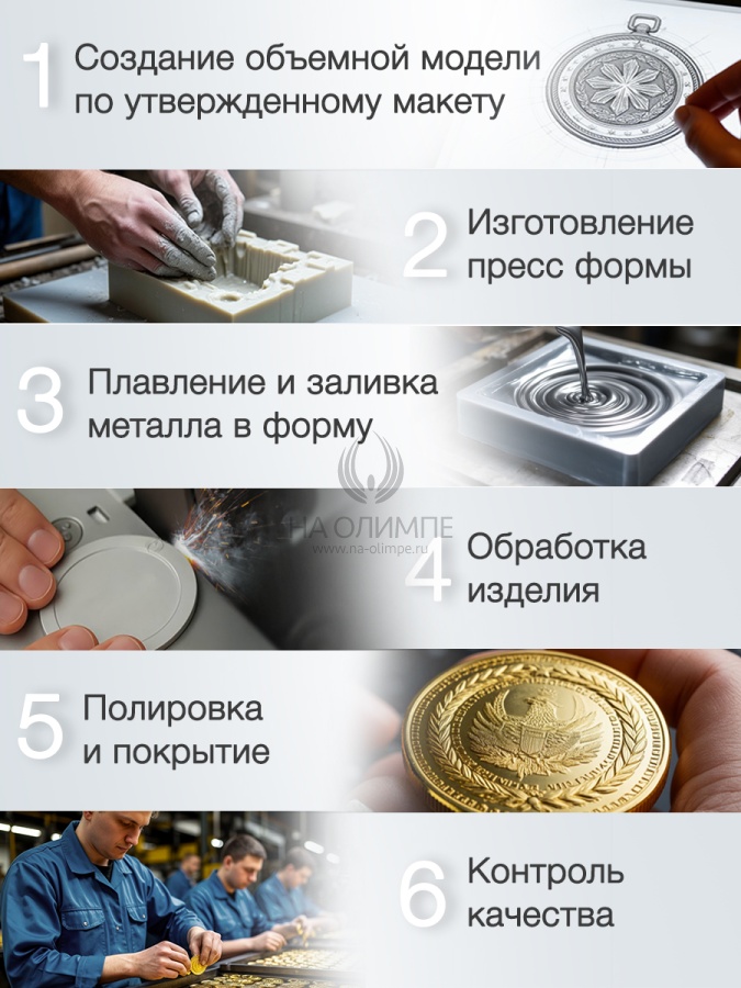 Каждая медаль выполняется на заказ по запросу клиента. Основные этапы включают: создание 3Д модели будущей медали, изготовление пресс-формы, плавление металла, заливка его в форму и последующая обработка готового изделия. Технология литья позволяет создавать сложные конструкции с высокой точностью и повторяемостью форм, что позволяет производить уникальные изделия высокого класса. Срок изготовления от 10 рабочих дней. Для подробной консультации и точного просчета необходимо обратиться к менеджеру.