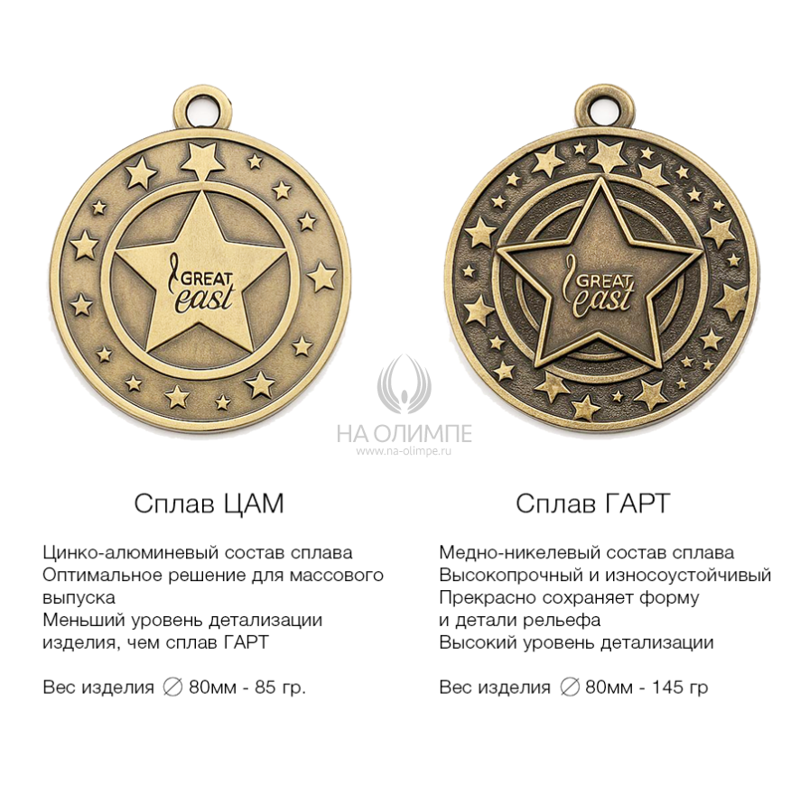 Изделия, выполненные из этого сплава ощутимее тяжелее, чем изделия в сплаве ЦАМ. Сплав ГАРТ прекрасно сохраняет форму и детали рельефа. Идеален для изготовления медалей премиального класса. Возможна любая форма и наполнение.