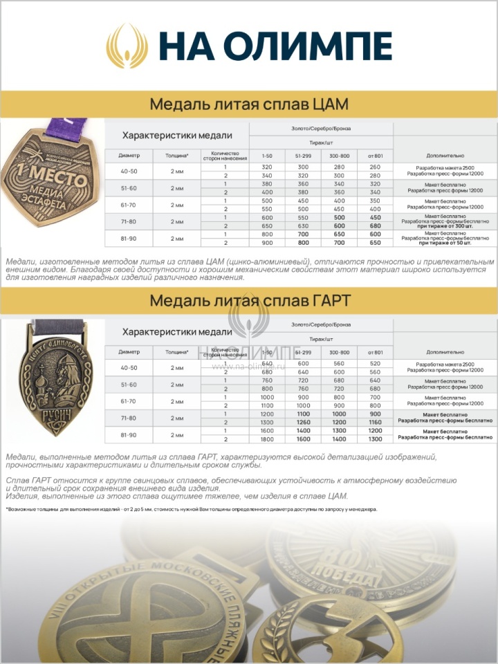 Изделия, выполненные из этого сплава ощутимее тяжелее, чем изделия в сплаве ЦАМ. Сплав ГАРТ прекрасно сохраняет форму и детали рельефа. Идеален для изготовления медалей премиального класса. Возможна любая форма и наполнение. Каждая медаль выполняется на заказ по запросу клиента. Основные этапы включают: создание 3Д модели будущей медали, изготовление пресс-формы, плавление металла, заливка его в форму и последующая обработка готового изделия. Технология литья позволяет создавать сложные конструкции с высокой точностью и повторяемостью форм, что позволяет производить уникальные изделия высокого класса. Срок изготовления от 10 рабочих дней. Для подробной консультации и точного просчета необходимо обратиться к менеджеру. Мы гарантируем лучшую цену! Есть предложение дешевле- снизим цену!