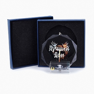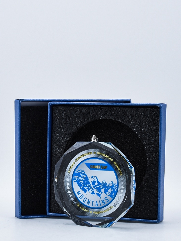 Медаль из стекла, толщиной 8мм с полноцветной печатью. Печать выполняется на uv-принтере уф-отверждаемыми чернилами. Изображение не выцветает и не желтеет со временем. Высокое качество печати позволяет наносить изображения с большой детализацией, любых цветов включая белый. Изображение наносится на обратную сторону медали зеркально, благодаря этому становится возможным оценить толщину материала награды и медаль раскрывается с лучшей стороны. Диаметр медали равен 80мм. Поставляется в комплекте с подарочным футляром (цвет футляра и подложка могут отличаться), лента в комплект не входит и заказывается отдельно. Вес награды без футляра 150гр.