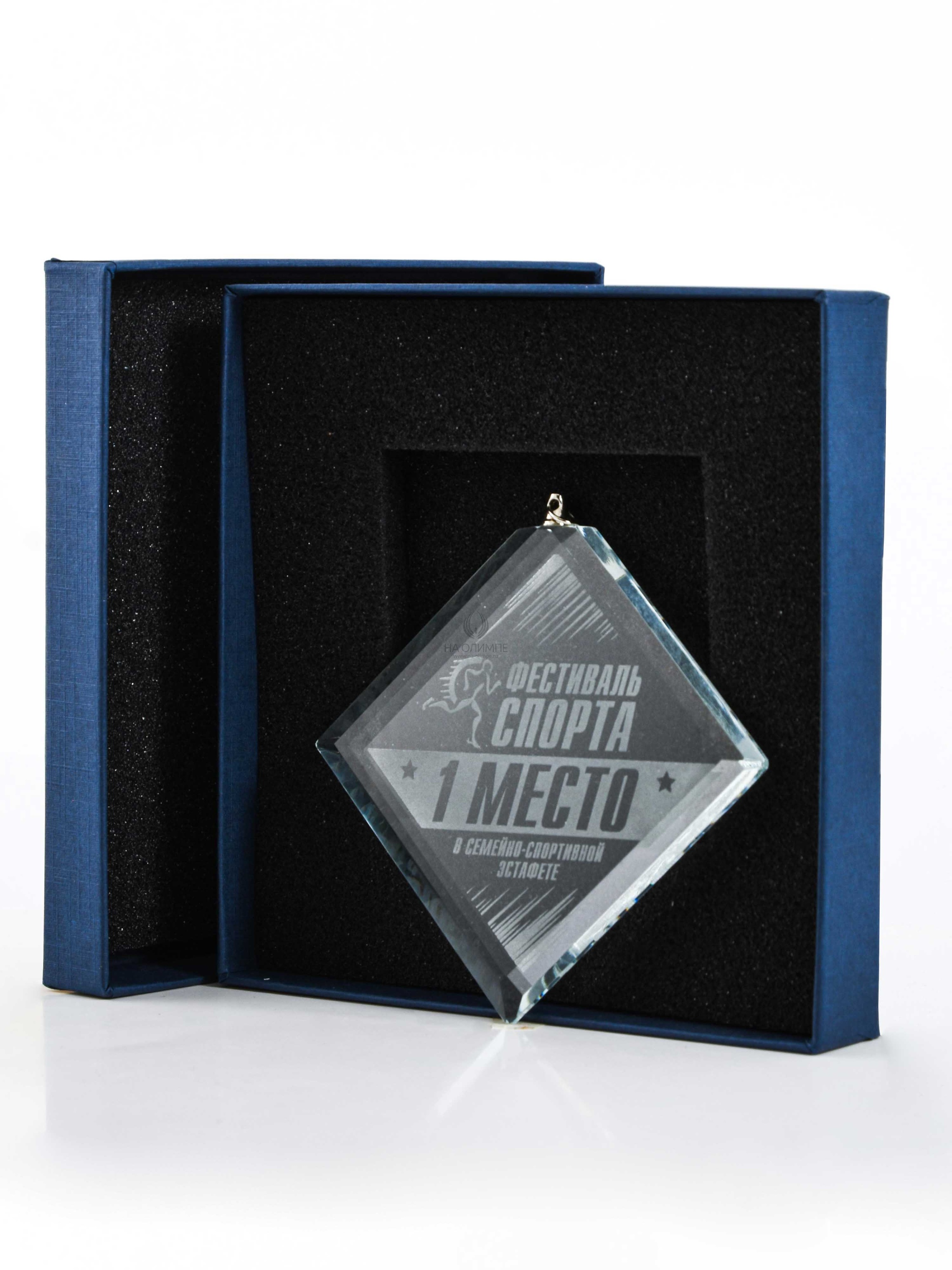 Медаль из стекла, толщиной 8мм. с нанесением лазерной гравировки. Лазерная гравировка производится на высокоточном оборудовании, что позволяет выполнить нанесение с практически любой степенью детализации. Гравировка не имеет видимого углубления внутрь награды, она выглядит и ощущается как матированное стекло. Размер стороны медали 6,7 см. Поставляется в комплекте с подарочным футляром (цвет футляра и подложка могут отличаться), лента в комплект не входит и заказывается отдельно. Вес награды без футляра 82гр.