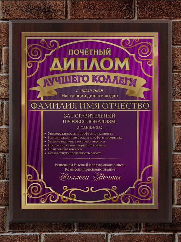 Плакетка "Диплом лучшего коллеги", размеры 255*200 мм