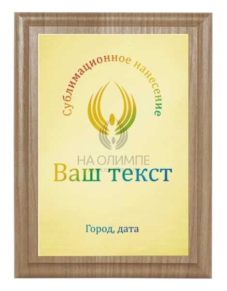 Плакетка из натурального дерева. В комплекте с металлической пластиной золотого цвета. Полноцветное нанесение любого количества символов и изображений включено в стоимость.