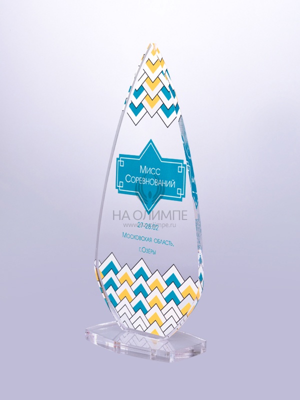 Награда из прозрачного акрила с цветной печатью на постаменте. Акриловая вертикальная основа вставляется в постамент в паз. Такая конструкция проста и надежна в эксплуатации и при транспортировке, так как не имеет склеенных элементов.