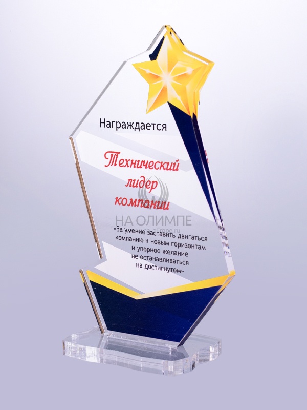 Награда из прозрачного акрила с цветной печатью на постаменте. Акриловая вертикальная основа вставляется в постамент в паз. Такая конструкция проста и надежна в эксплуатации и при транспортировке, так как не имеет склеенных элементов.