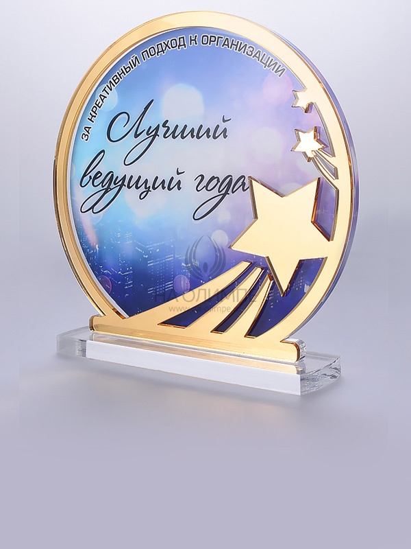 Приз из золотого и прозрачного акрила с цветным нанесением.