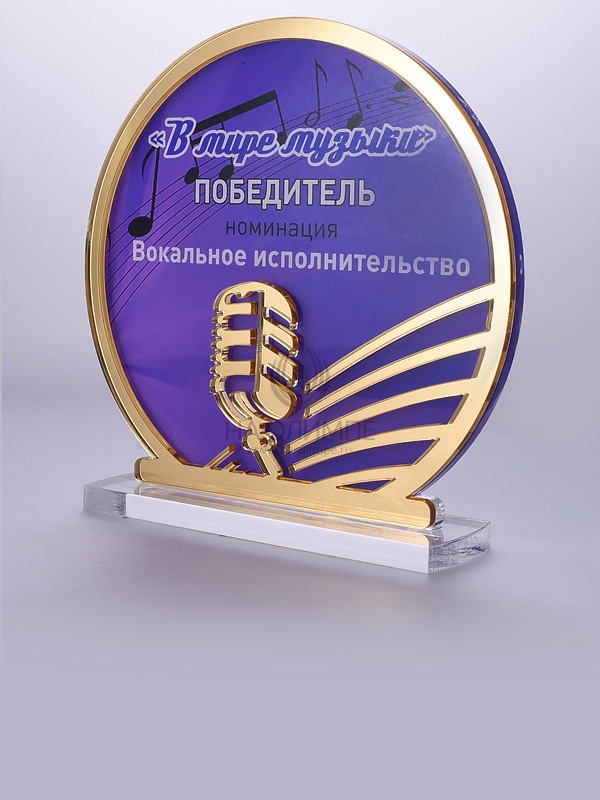 Приз из золотого и прозрачного акрила с цветным нанесением.