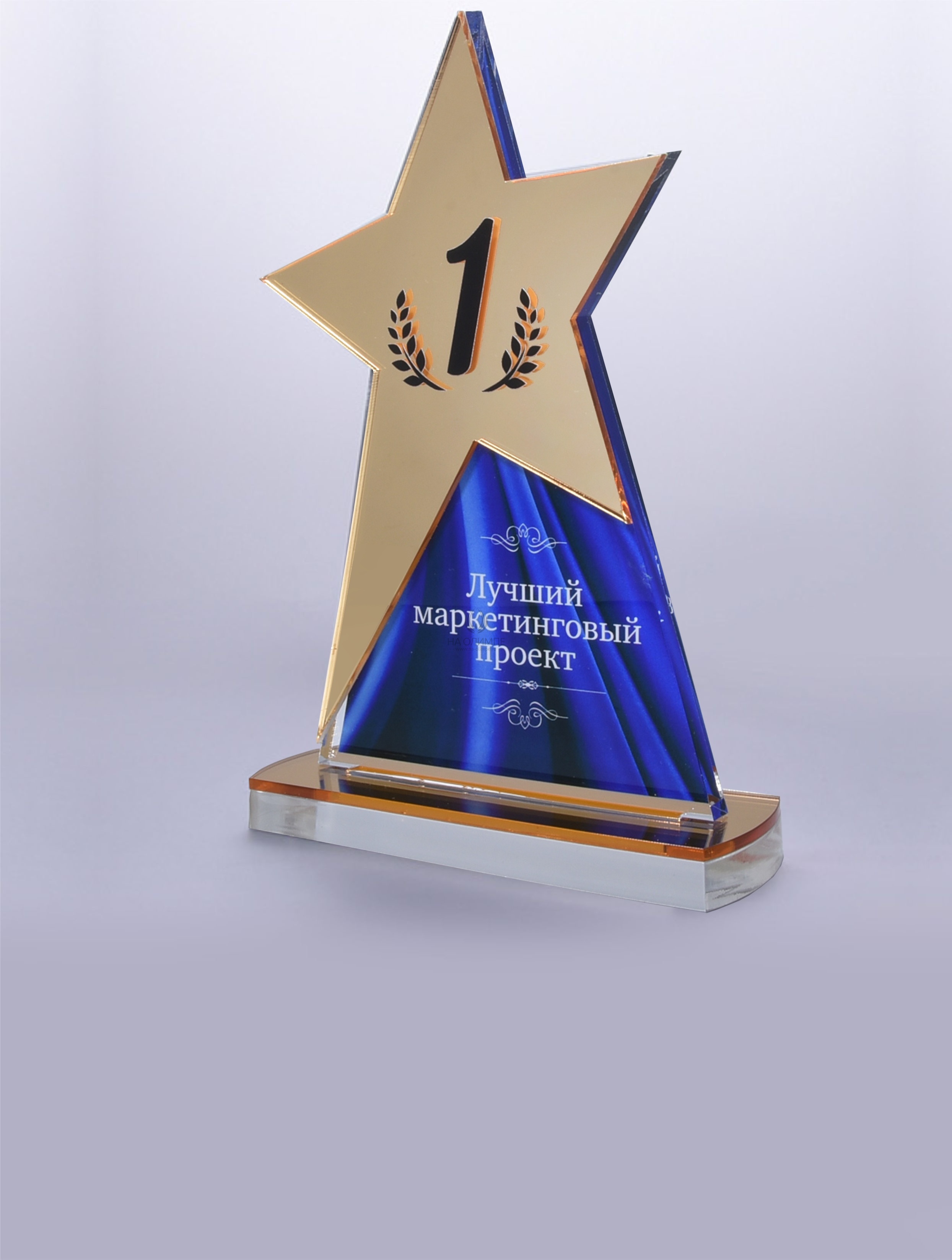 Приз из золотого и прозрачного акрила с цветным нанесением.
