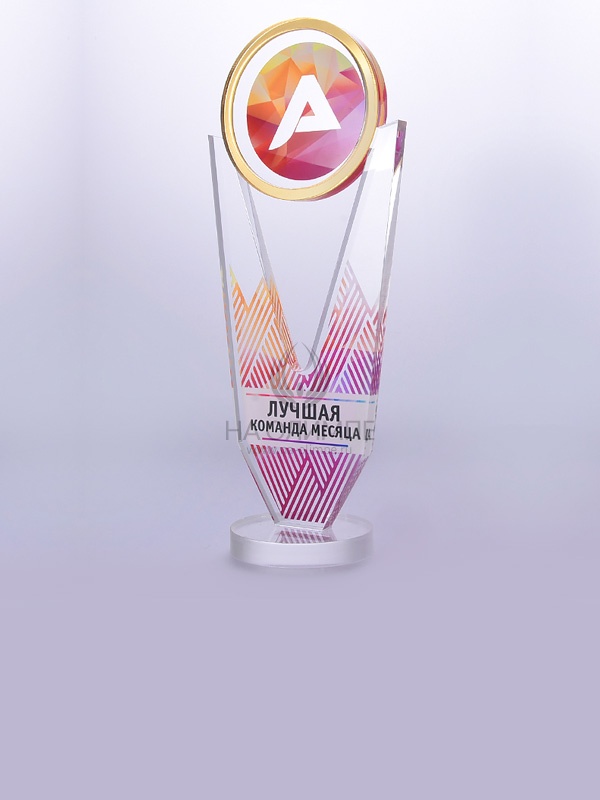 Приз из золотого и прозрачного акрила с цветным нанесением.