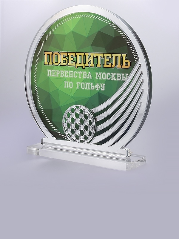 Приз из прозрачного и золотого акрила с цветной печатью высотой 160 мм.