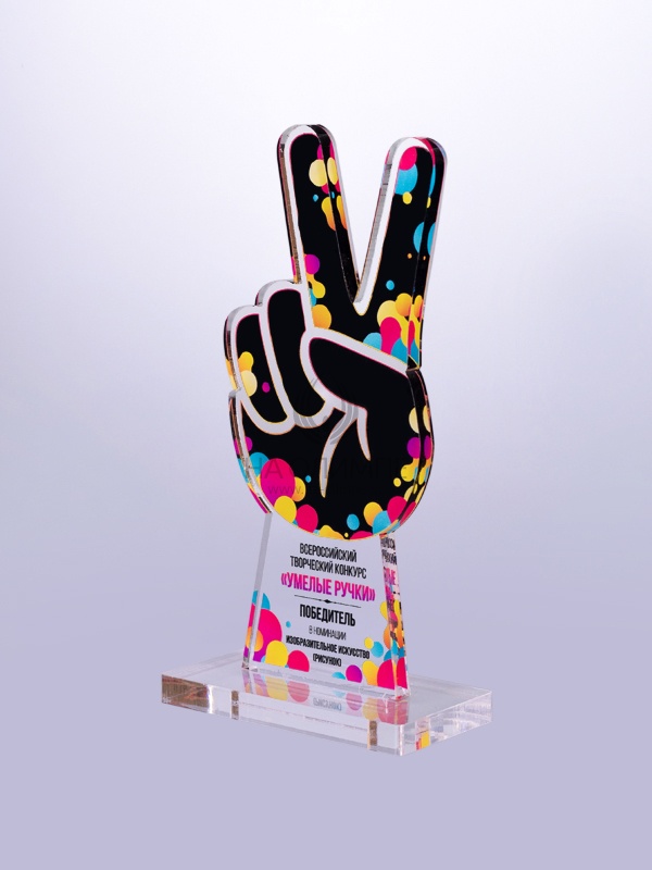 Награда из прозрачного акрила с цветной печатью на постаменте. Акриловая вертикальная основа вставляется в постамент в паз. Такая конструкция проста и надежна в эксплуатации и при транспортировке, так как не имеет склеенных элементов.