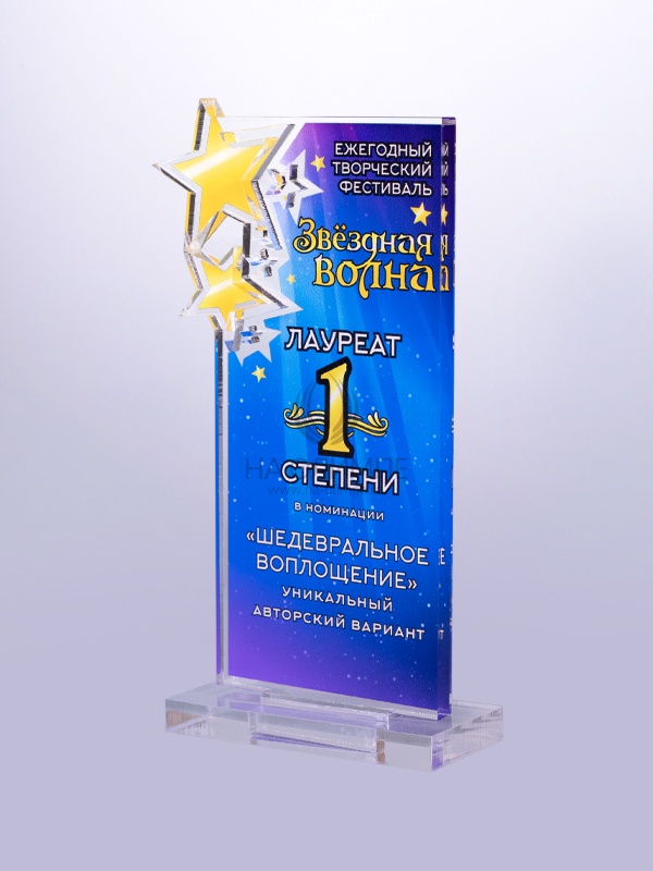 Награда из прозрачного акрила с цветной печатью на постаменте. Акриловая вертикальная основа вставляется в постамент в паз. Такая конструкция проста и надежна в эксплуатации и при транспортировке, так как не имеет склеенных элементов.