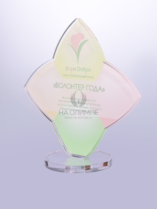 Награда из прозрачного акрила с цветной печатью на постаменте. Акриловая вертикальная основа вставляется в постамент в паз. Такая конструкция проста и надежна в эксплуатации и при транспортировке, так как не имеет склеенных элементов.