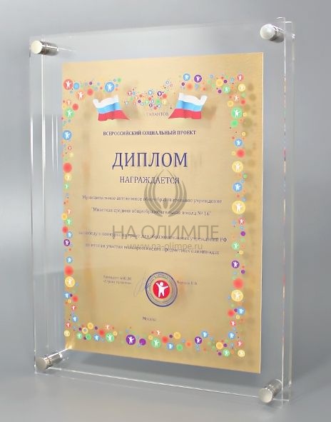 Приз из 2-х листов прозрачного акрила с полноцветным цифровым нанесением, с дистанционными держателями и подложкой из золотистого матового металла.