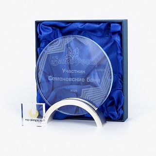Стеклянная награда с гравировкой на металлическом постаменте. Толщина стекла 10 мм. Поставляется в комплекте с подарочным футляром. Вес награды без футляра 465гр.Стоимость указана за нанесение на одной стороне, гравировка выполняется на задней стенке награды. Возможность нанесения на дополнительной стороне и стоимость этих работ можно уточнить у менеджеров.