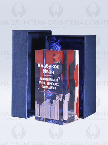 Награда из оптического стекла с 3D гравировкой и цветным нанесением. Поставляется в комплекте с подарочным футляром. Вес награды без футляра 895гр. Стоимость указана за нанесение на лицевой и оборотной стороне награды. Возможность нанесения на дополнительной стороне и стоимость этих работ можно уточнить у менеджеров.