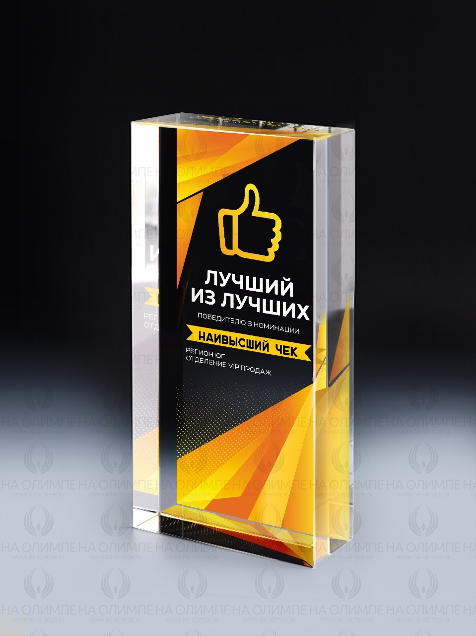 Награда из оптического стекла с цветным нанесением. Поставляется в комплекте с подарочным футляром. Вес награды без футляра 1290гр. Стоимость указана за нанесение на лицевой и оборотной стороне награды. Возможность нанесения на боковые  стороны  и стоимость этих работ можно уточнить у менеджеров.