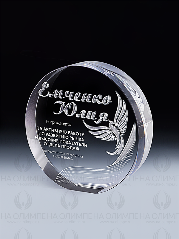 Награда из оптического стекла с гравировкой. Поставляется в комплекте с подарочным футляром. Вес награды без футляра 900гр. Стоимость указана за нанесение на одной стороне, гравировка выполняется на задней стенке награды.