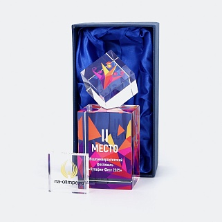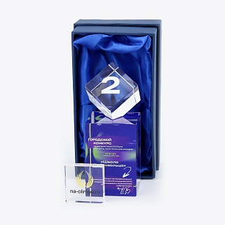 Награда из оптического стекла с цветным нанесением. Поставляется в комплекте с подарочным футляром. Вес награды без футляра 769гр. Стоимость указана за нанесение на лицевой и оборотной стороне награды. Возможность нанесения на боковые стороны и стоимость этих работ можно уточнить у менеджеров.