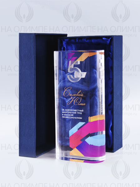 Награда из оптического стекла с 3D гравировкой и цветным нанесением. Поставляется в комплекте с подарочным футляром. Вес награды без футляра 1275гр. Стоимость указана за нанесение на лицевой и оборотной стороне награды.