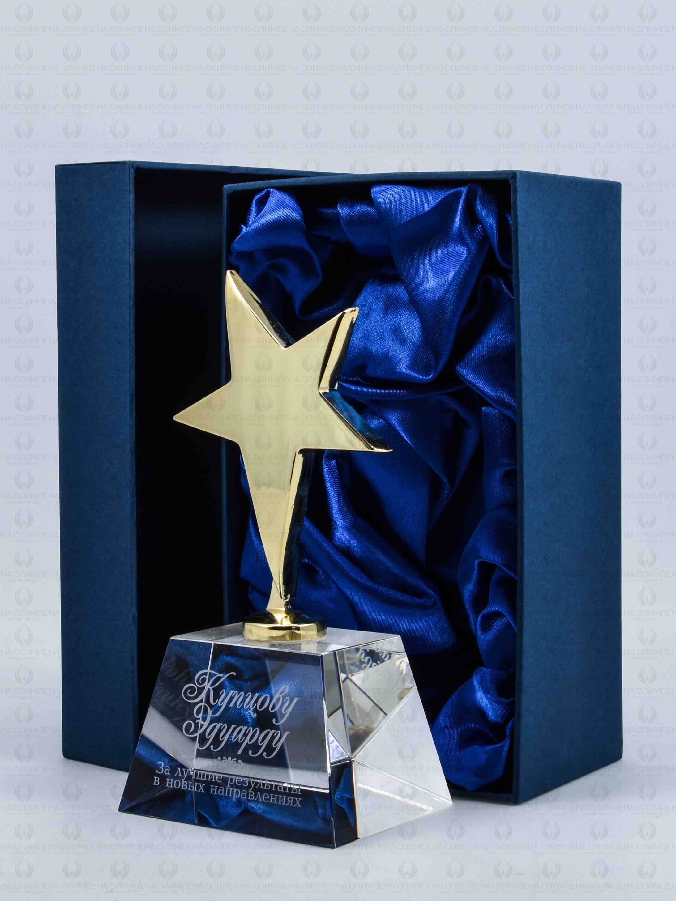 Металлическая звезда золотого цвета на стеклянном постаменте с гравировкой. Поставляется в комплекте с подарочным футляром. Вес награды без футляра 600гр.
