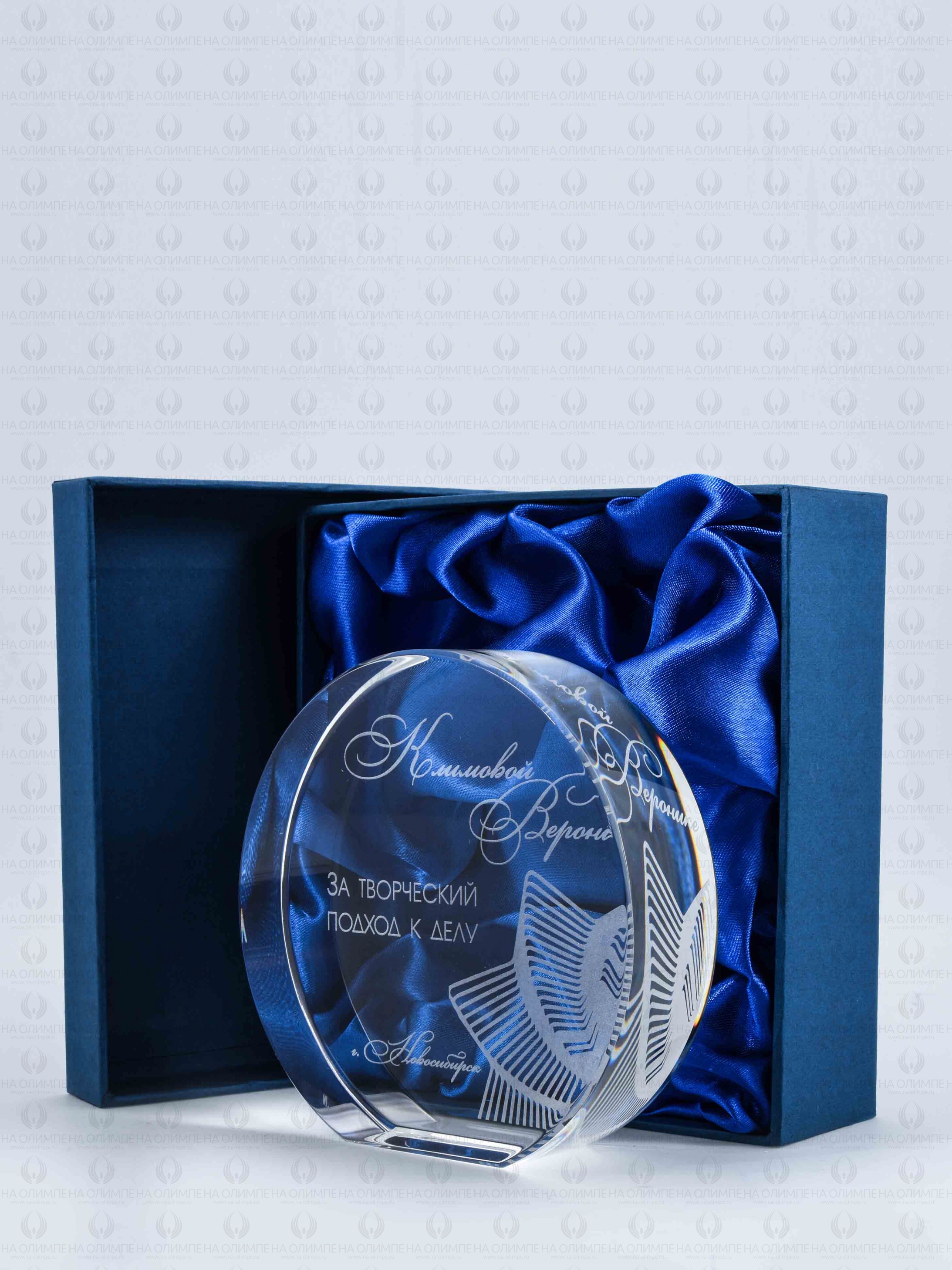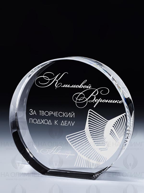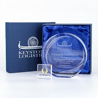 Стеклянная награда с гравировкой. Толщина стекла 35 мм. Поставляется в комплекте с подарочным футляром. Вес награды без футляра 1150гр. Стоимость указана за нанесение на одной стороне, гравировка выполняется на задней стенке награды.