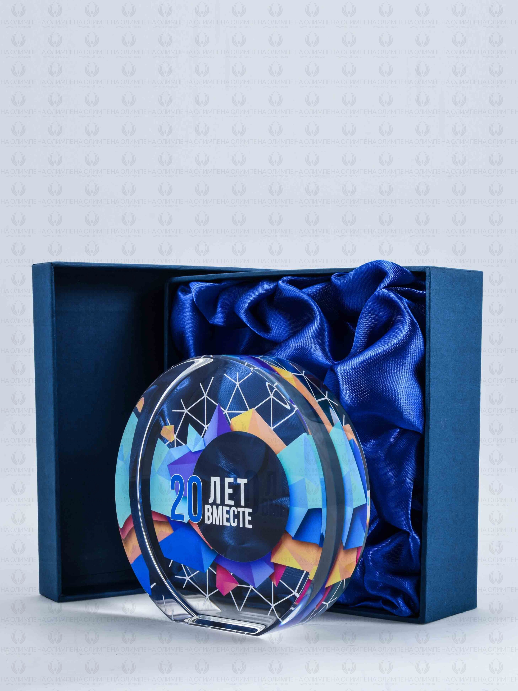Стеклянная награда с полноцветной печатью. Толщина стекла 35 мм. Поставляется в комплекте с подарочным футляром. Вес награды без футляра 1150гр.Стоимость указана за нанесение на одной стороне, печать выполняется на задней стенке награды. Возможность нанесения на дополнительной стороне и стоимость этих работ можно уточнить у менеджеров.