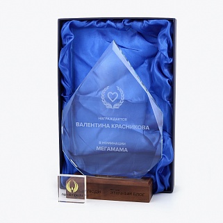 Стеклянная награда с гравировкой. Толщина стекла 15 мм. Поставляется в комплекте с подарочным футляром. Вес награды без футляра 860гр. Стоимость указана за нанесение на одной стороне, гравировка выполняется на задней стенке награды.