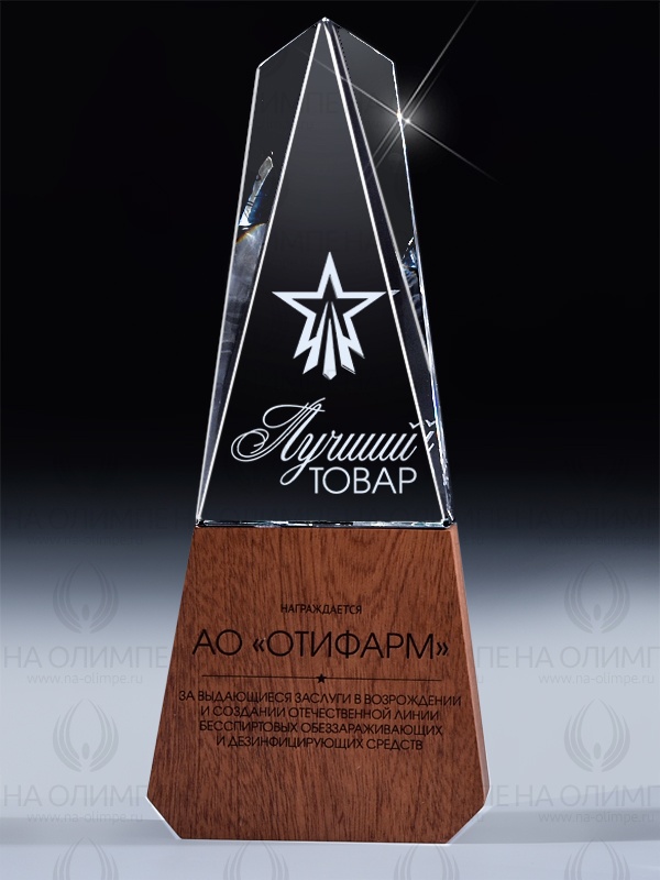 Стеклянная награда на деревянном постаменте с цветным нанесением. Толщина стекла 36 мм. Поставляется в комплекте с подарочным футляром. Вес награды без футляра 1000гр. Стоимость указана за нанесение на одной стороне, гравировка выполняется на передней стенке награды.