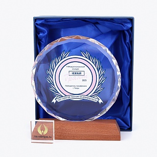 Стеклянная награда с полноцветным нанесением. Толщина стекла 15 мм. Может доукомплектовываться металлической или заливной табличкой с текстом и рисунком. Табличка в комплект не входит и заказывается отдельно. Награда поставляется в комплекте с подарочным футляром. Вес награды без футляра 1080гр. Стоимость указана за нанесение на одной стороне, печать выполняется на задней стенке награды. Возможность нанесения на дополнительной стороне и стоимость этих работ можно уточнить у менеджеров.