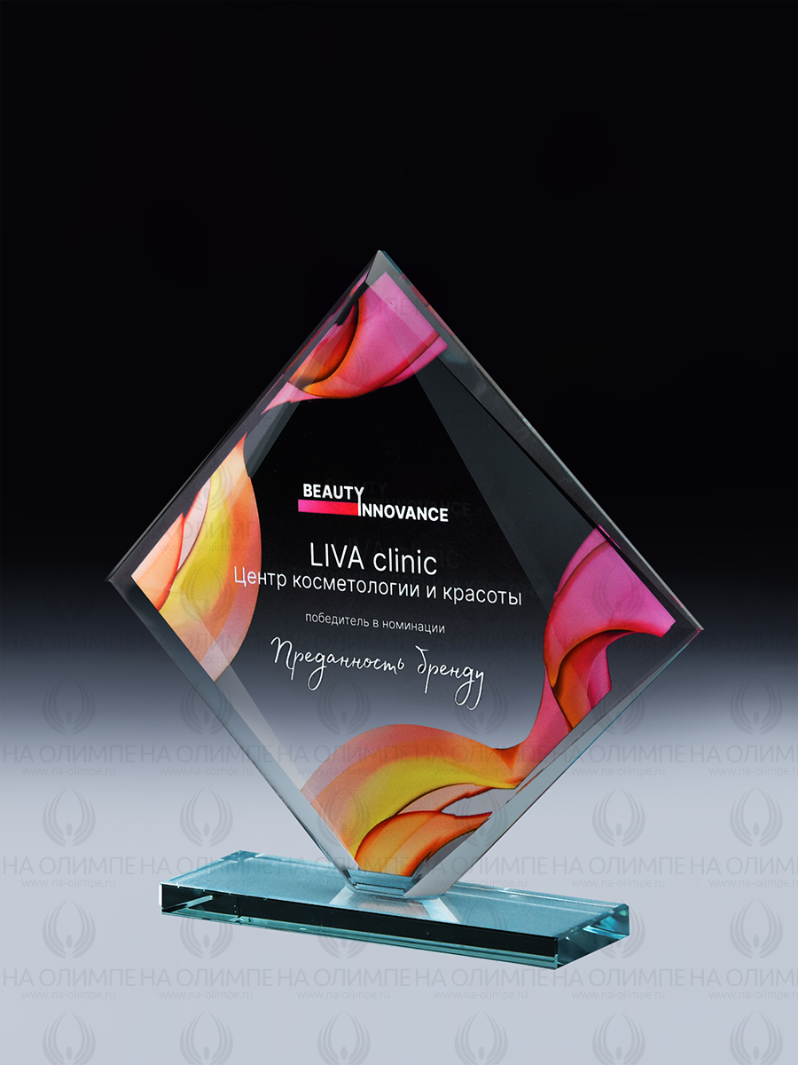 Стеклянная награда с полноцветным нанесением. Толщина стекла 10 мм. Поставляется в комплекте с подарочным футляром. Вес награды без футляра 547гр. Стоимость указана за нанесение на одной стороне, печать выполняется на задней стенке награды