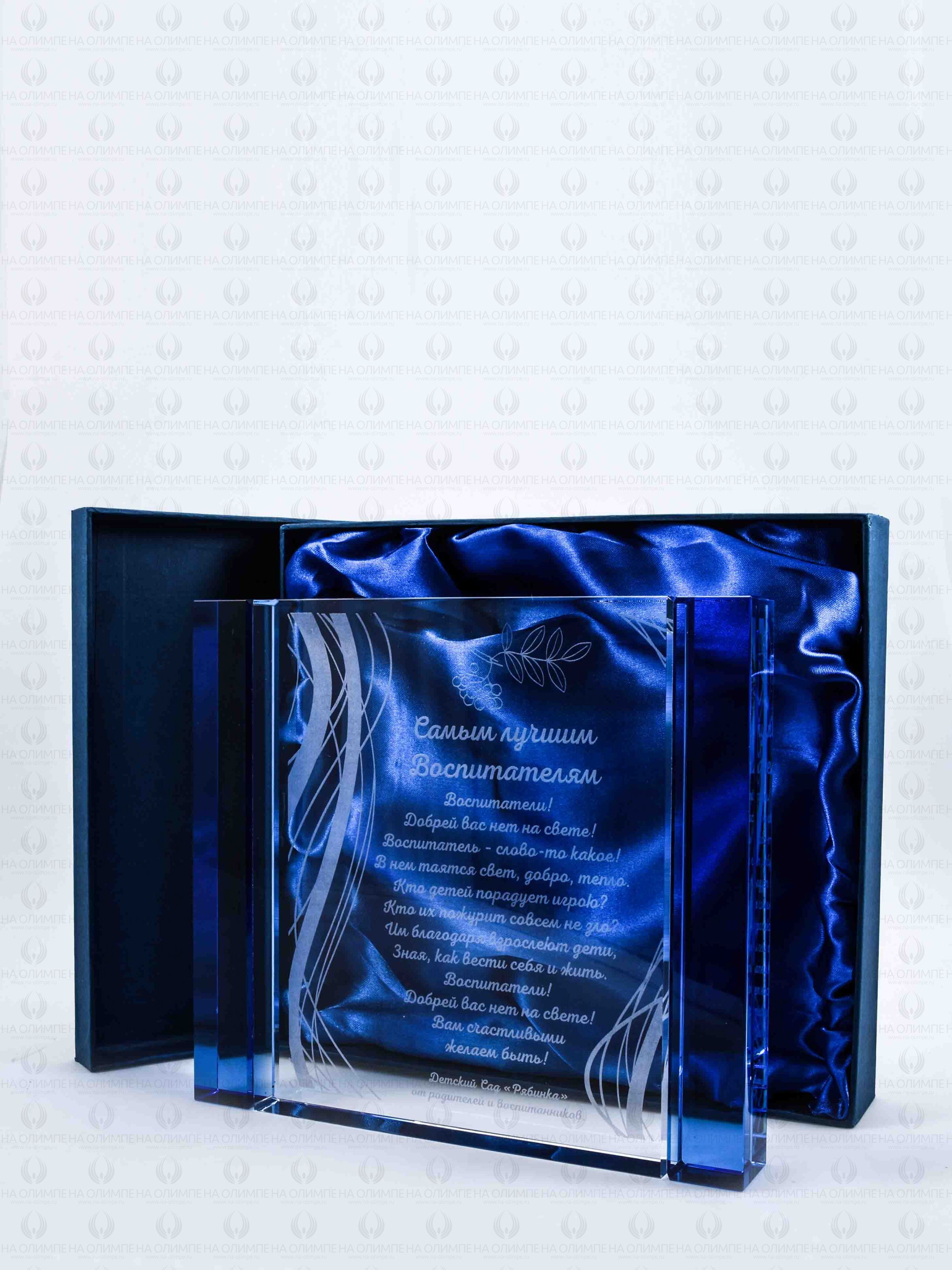 Стеклянная награда с гравировкой. Поставляется в комплекте с подарочным футляром. Толщина стекла 32 мм. Вес награды без футляра 3550гр. Стоимость указана за нанесение на одной стороне, гравировка выполняется на задней стенке награды.