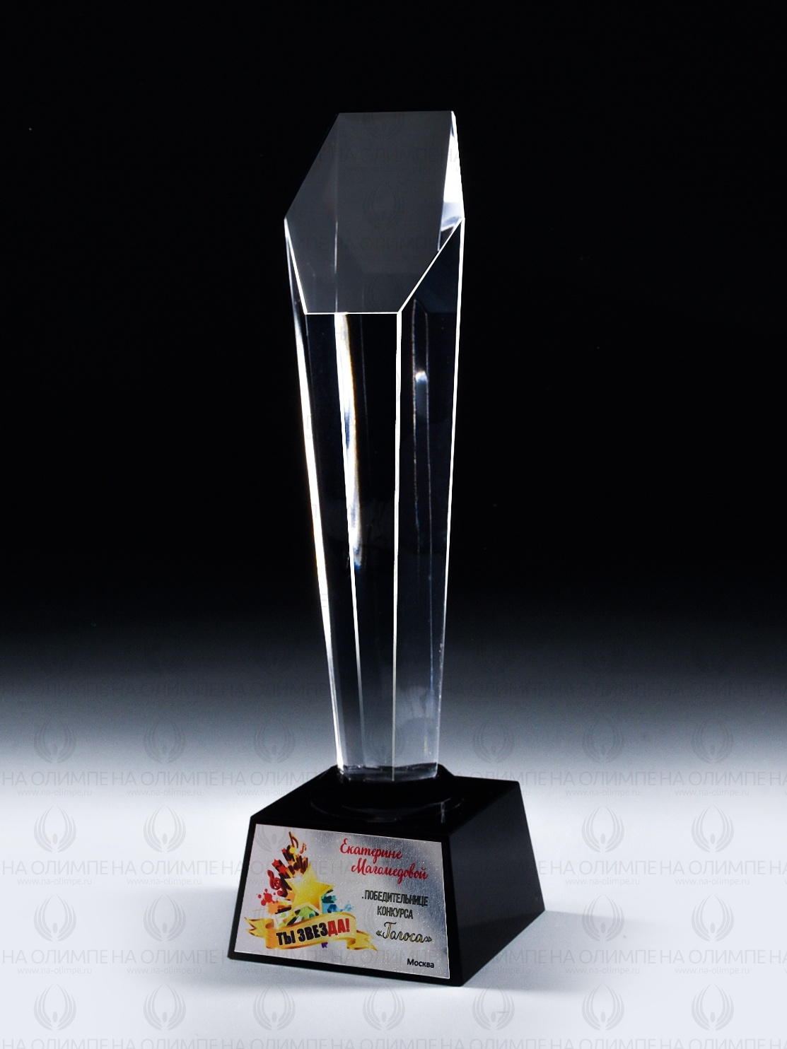 Стеклянная награда на постаменте из черного стекла. Может доукомплектовываться металлической или заливной табличкой с текстом и рисунком. Табличка в комплект не входит. Награда не укомплектована подарочной коробкой.