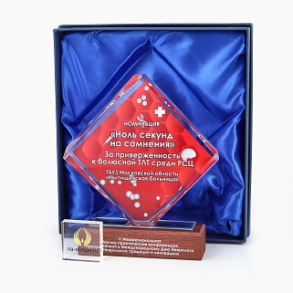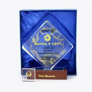 Стеклянная награда с полноцветным нанесением. Толщина стекла 16 мм. Награду можно доукомплектовывать металлической или заливной табличкой с текстом и рисунком. Табличка в комплект не входит и заказывается отдельно. Поставляется в комплекте с подарочным футляром. Вес награды без футляра 585гр. Стоимость указана за нанесение на одной стороне, печать выполняется на задней стенке награды.