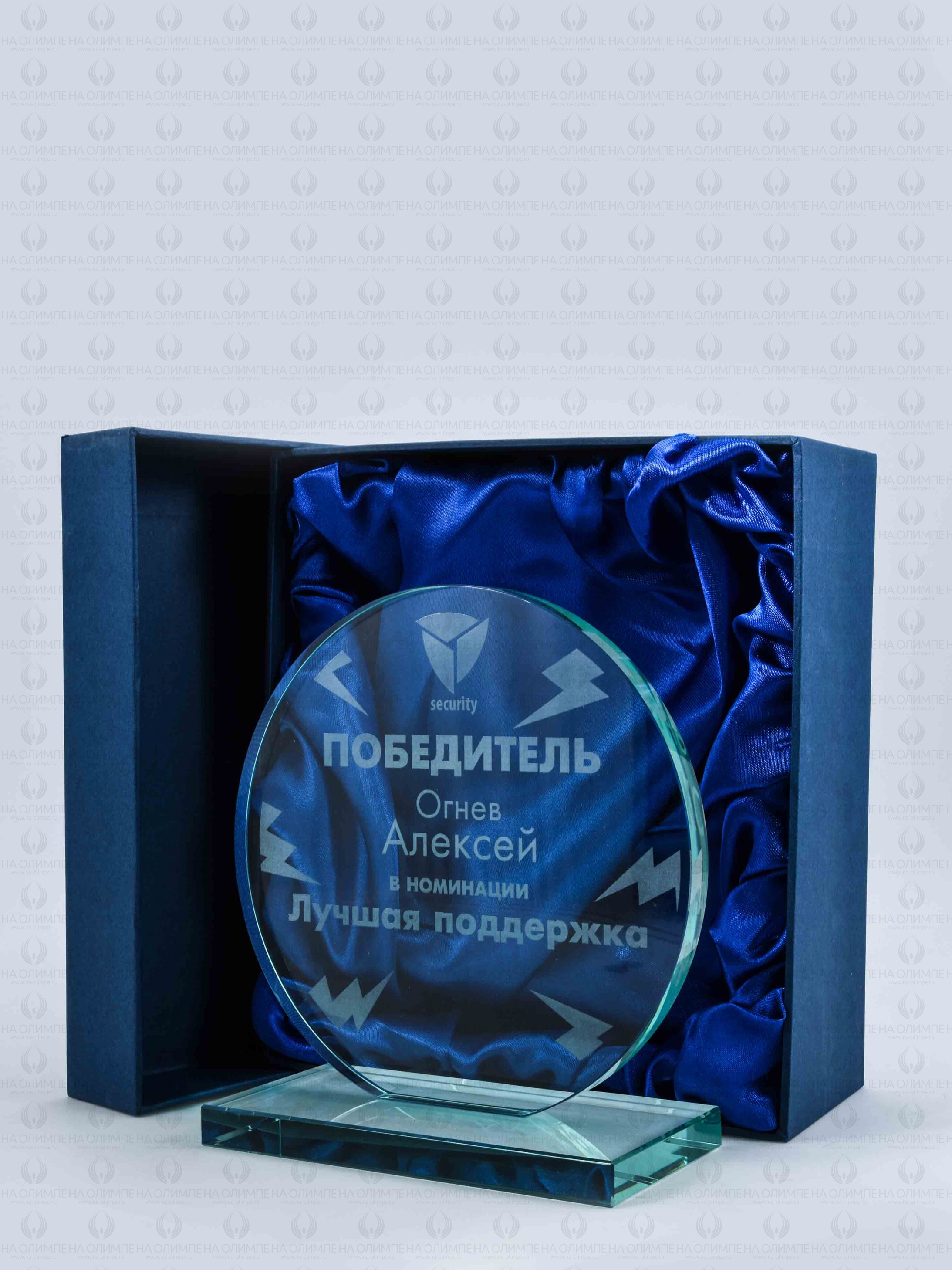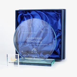 Стеклянная награда с гравировкой. Толщина стекла 12 мм. Поставляется в комплекте с подарочным футляром. Вес награды без футляра 1340гр.  Стоимость указана за нанесение на одной стороне, гравировка выполняется на передней стенке награды.