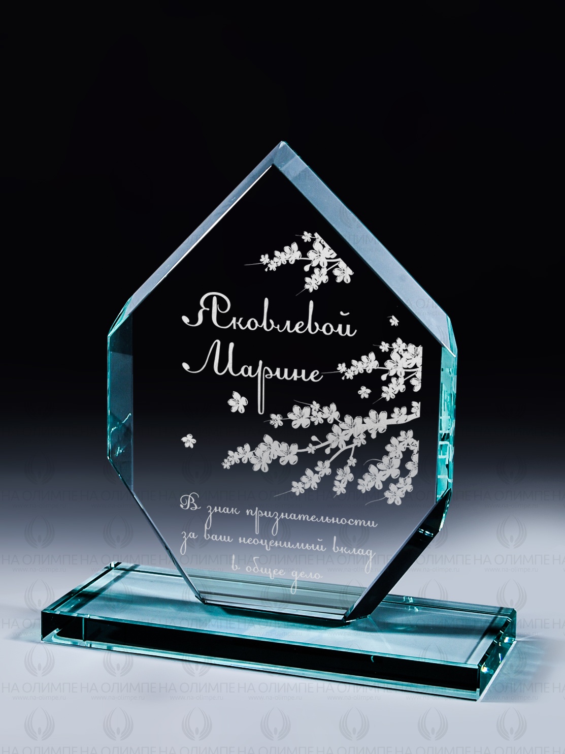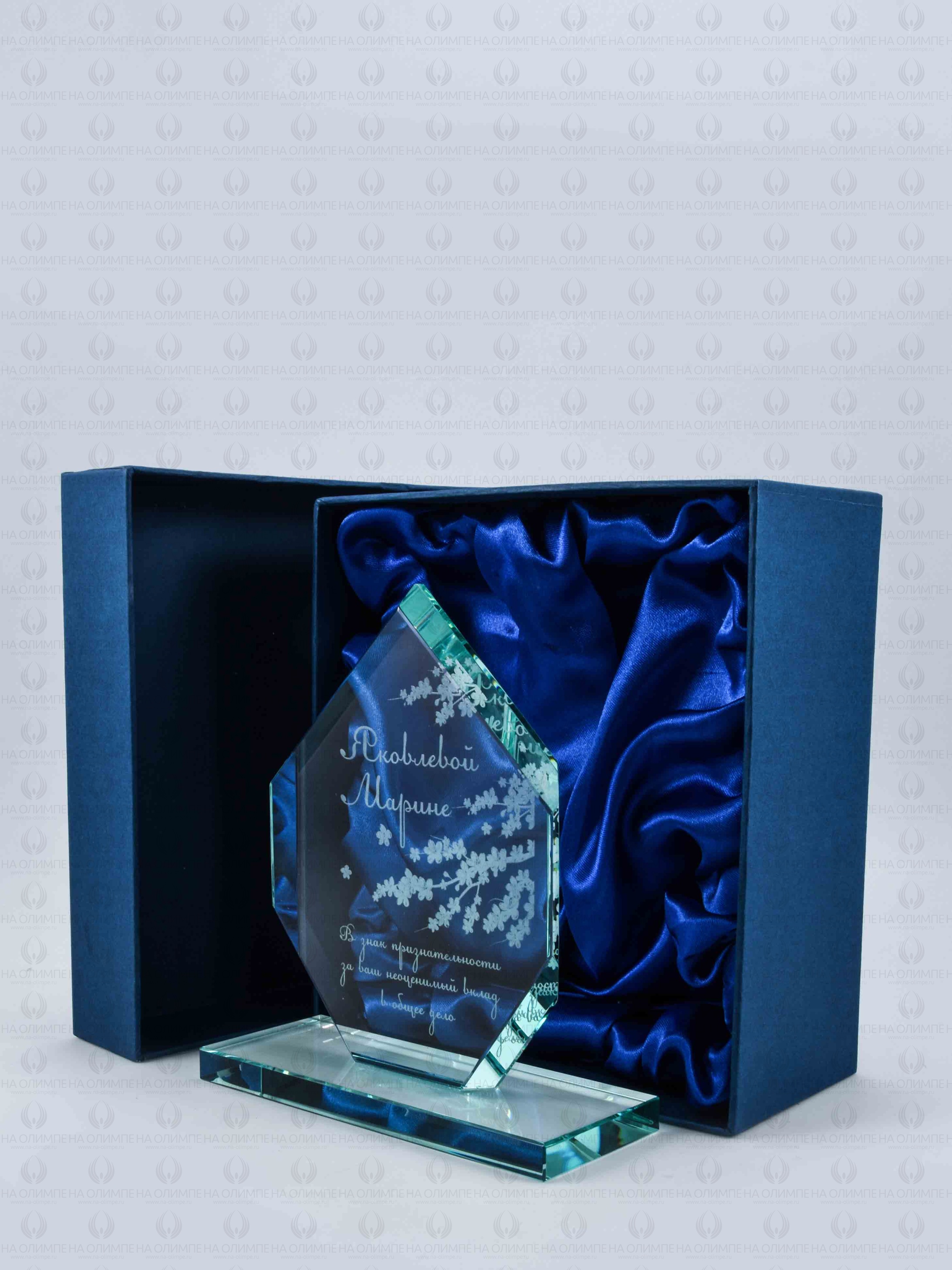Стеклянная награда с гравировкой. Толщина стекла 12 мм. Поставляется в комплекте с подарочным футляром. Вес награды без футляра 819гр. Стоимость указана за нанесение на одной стороне, гравировка выполняется на передней стенке награды.