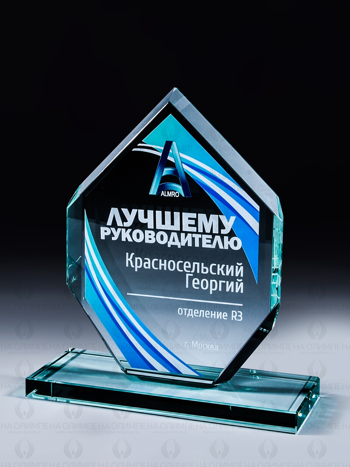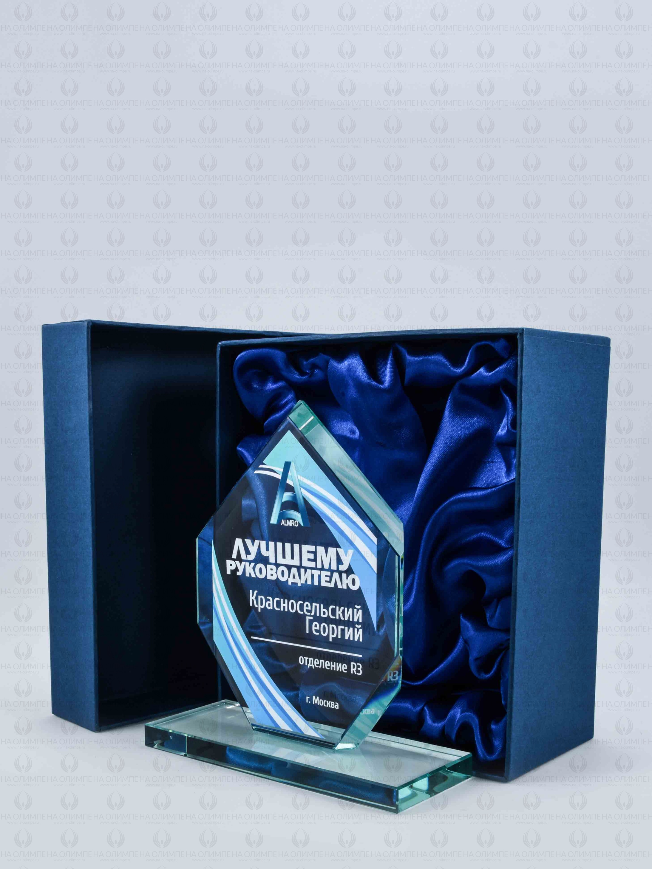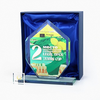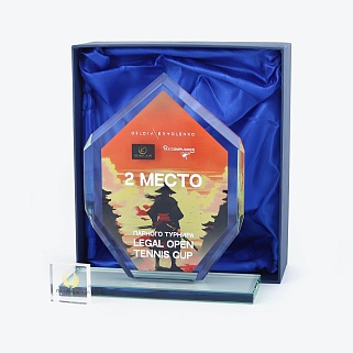 Стеклянная награда с полноцветным нанесением. Толщина стекла 12 мм. Поставляется в комплекте с подарочным футляром. Вес награды без футляра 819гр. Стоимость указана за нанесение на одной стороне, печать выполняется на передней стенке награды.