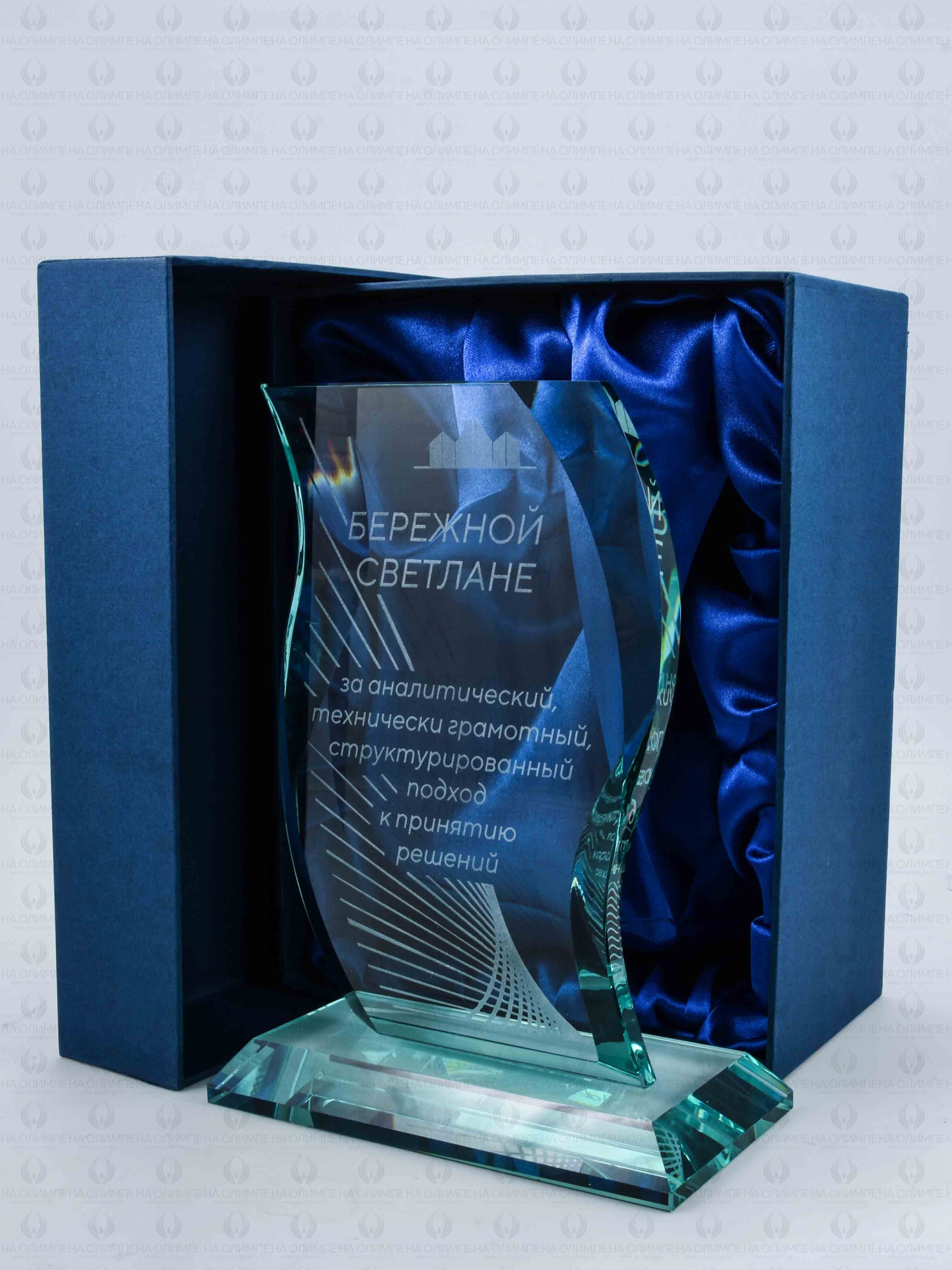 Стеклянная награда с гравировкой. Толщина стекла 19 мм. Поставляется в комплекте с подарочным футляром. Вес награды без футляра 1500гр. Стоимость указана за нанесение на одной стороне, гравировка выполняется на передней стенке награды.
