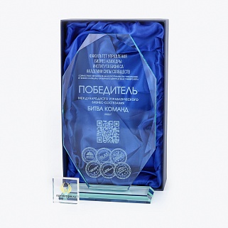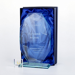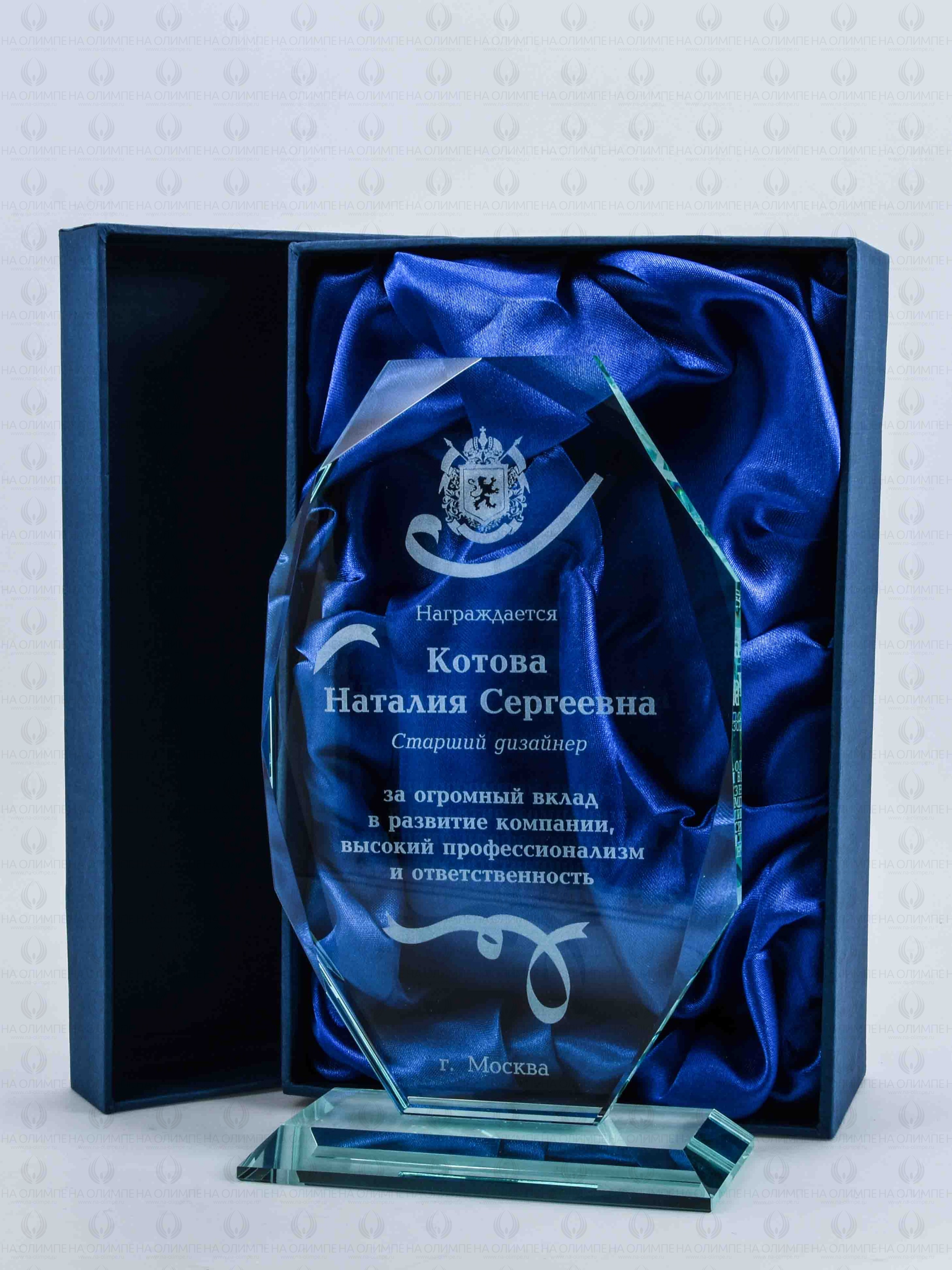 Стеклянная награда с гравировкой. Толщина стекла 12мм. Поставляется в комплекте с подарочным футляром. Вес награды без футляра 1120гр. Стоимость указана за нанесение на одной стороне, гравировка выполняется на передней стенке награды.