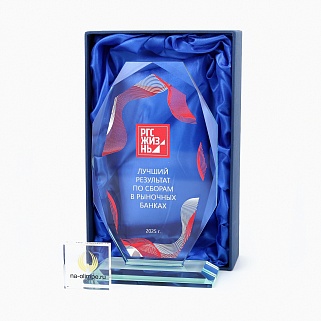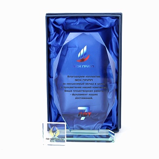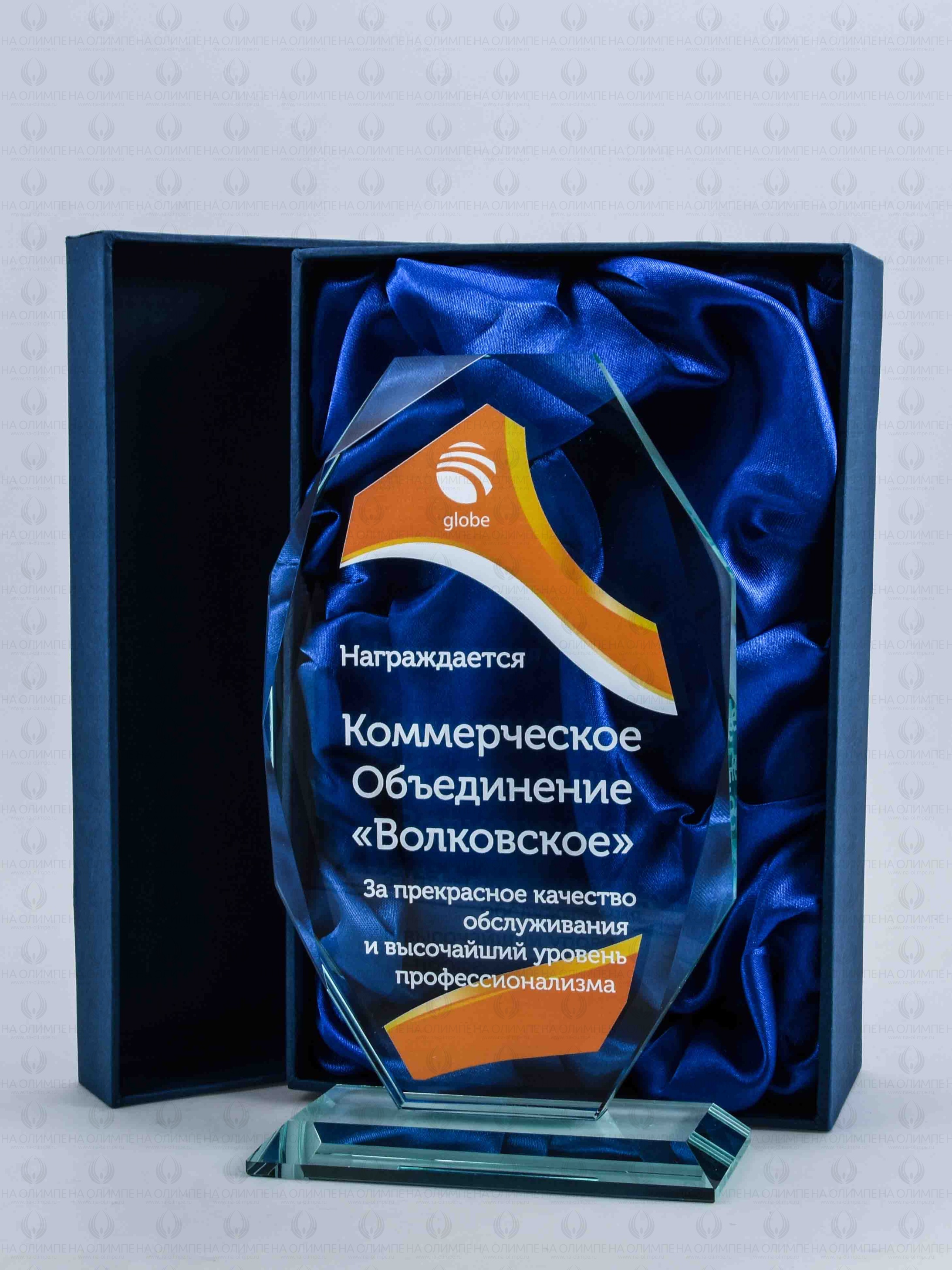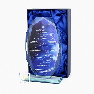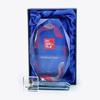 Стеклянная награда с полноцветным нанесением. Толщина стекла 12 мм. Поставляется в комплекте с подарочным футляром. Вес награды без футляра 1120гр. Стоимость указана за нанесение на одной стороне, печать выполняется на передней стенке награды.