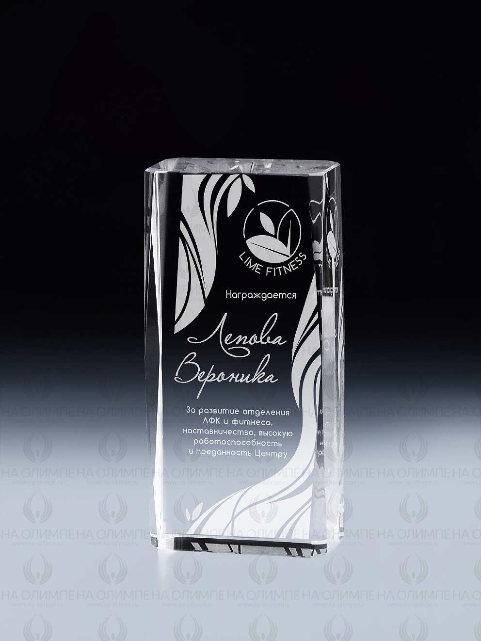 Награда из оптического стекла с гравировкой. Поставляется в комплекте с подарочным футляром. Вес награды без футляра 467гр. Стоимость указана за нанесение на одной стороне. Возможность нанесения на дополнительной стороне и стоимость этих работ можно уточнить у менеджеров.