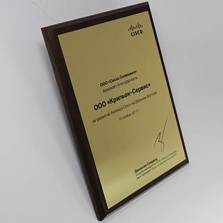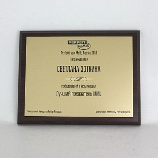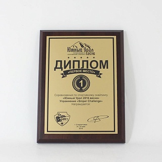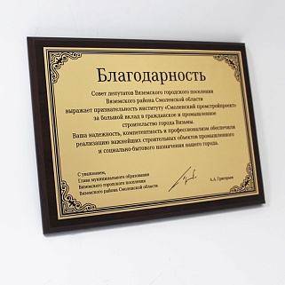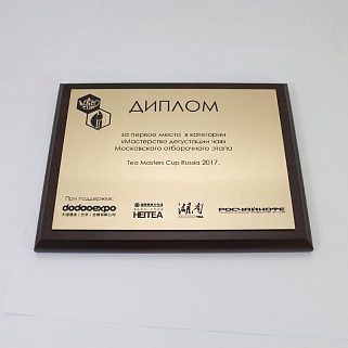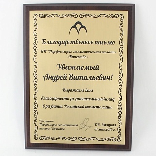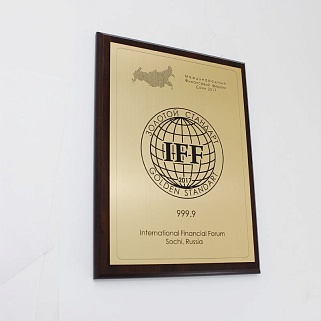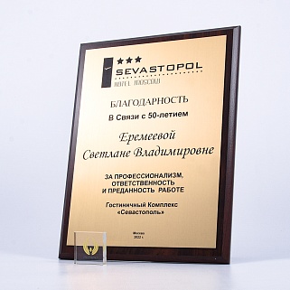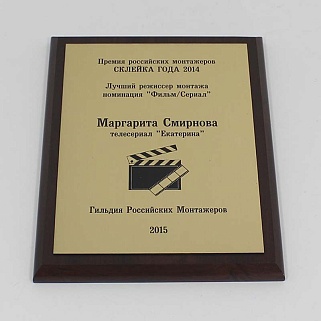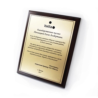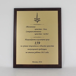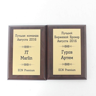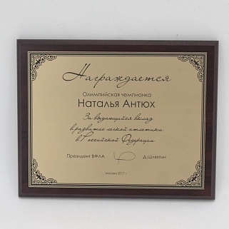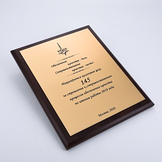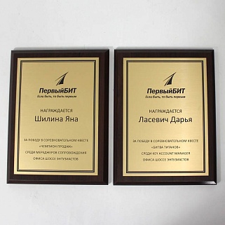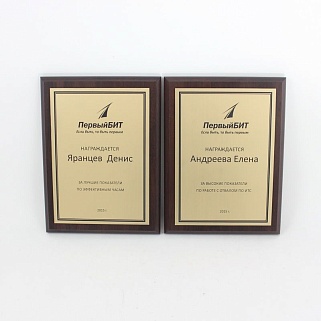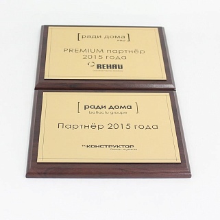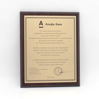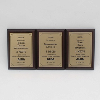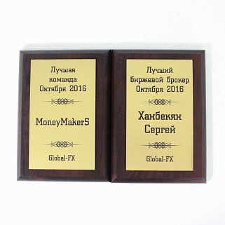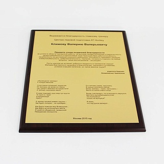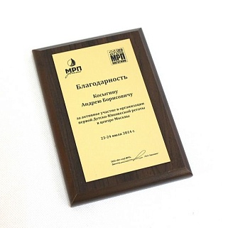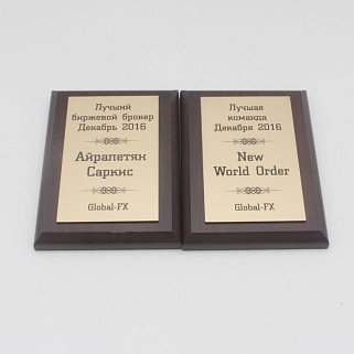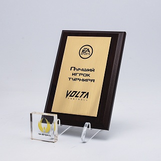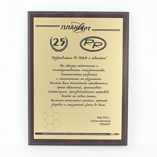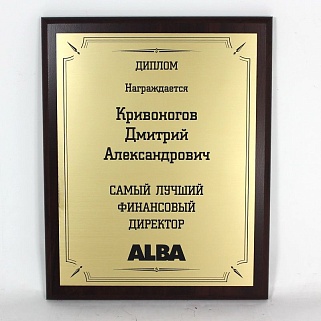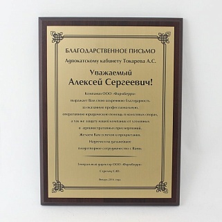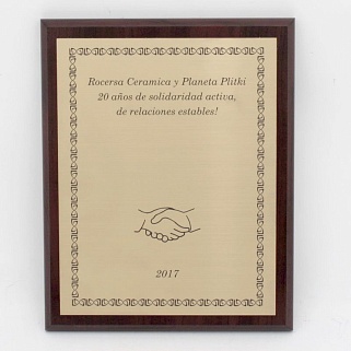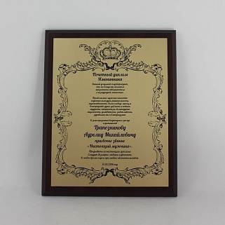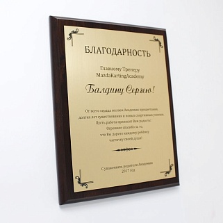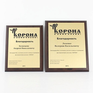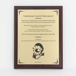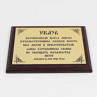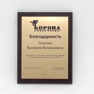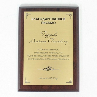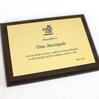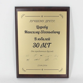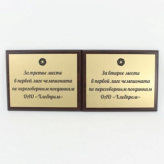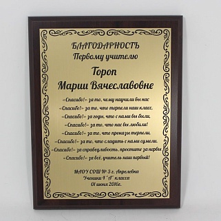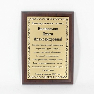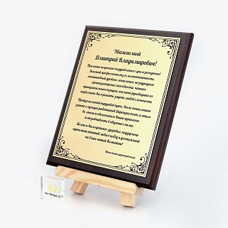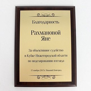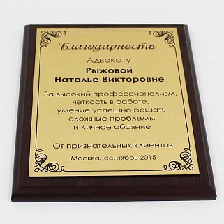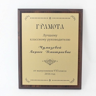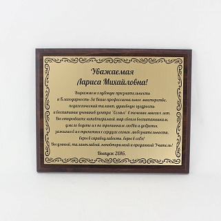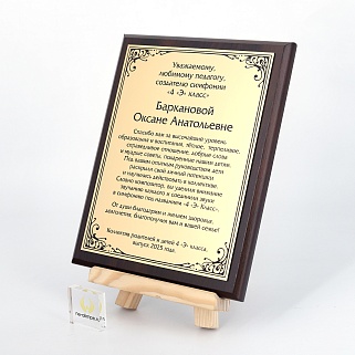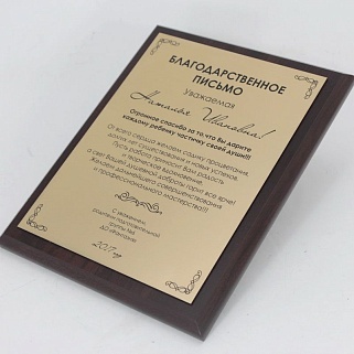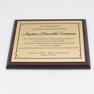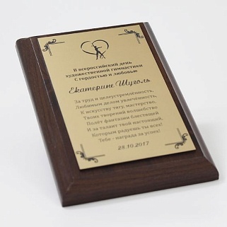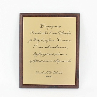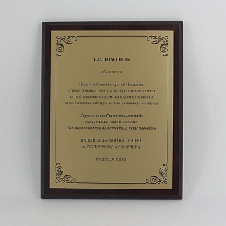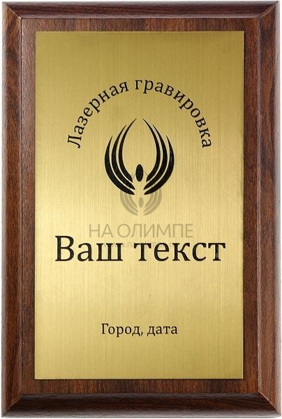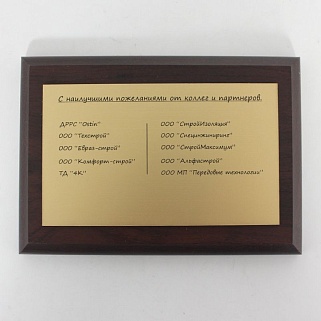 Плакетка из натурального дерева. В комплекте с пластиковой пластиной золотого цвета. После гравировки раскрывается черным цветом. Нанесение любого количества символов и изображений включено в стоимость.