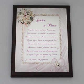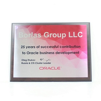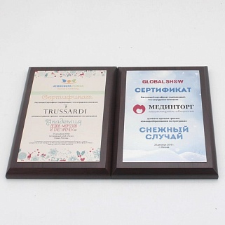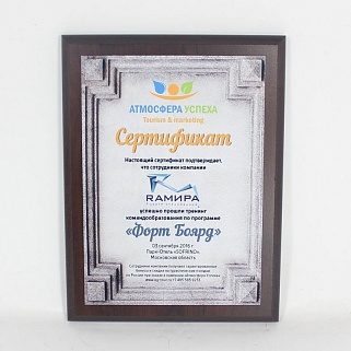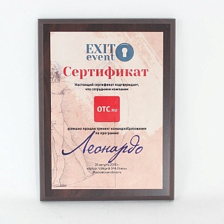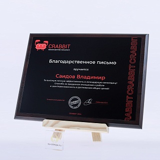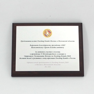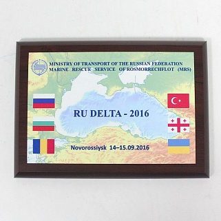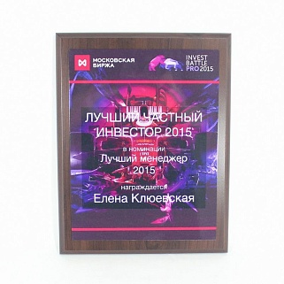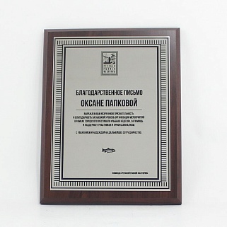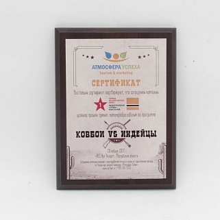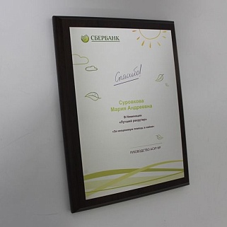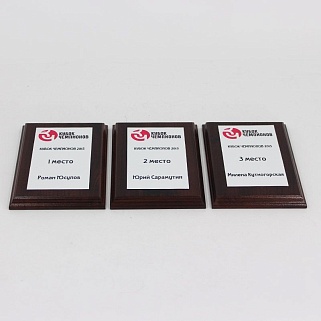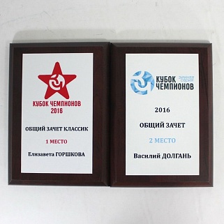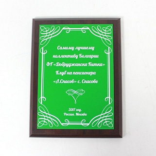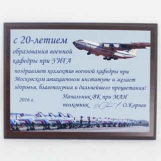 Плакетка из натурального дерева. В комплекте с металлической пластиной белого цвета. Полноцветное нанесение любого количества символов и изображений включено в стоимость.