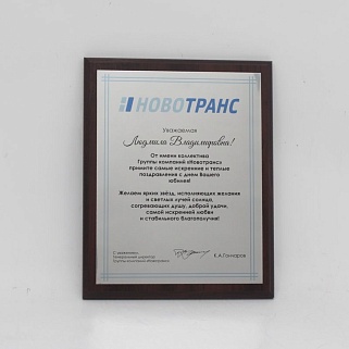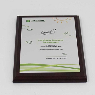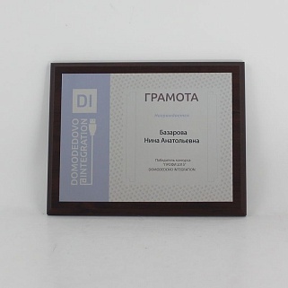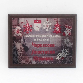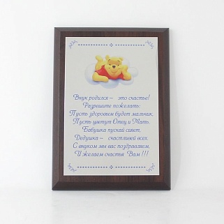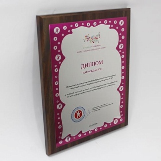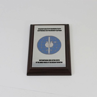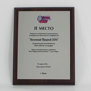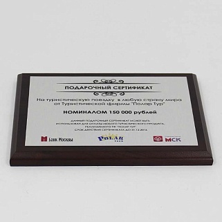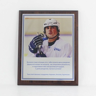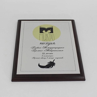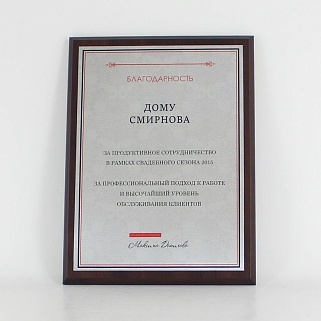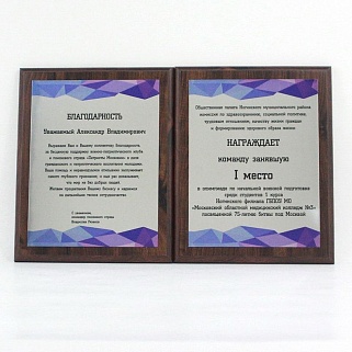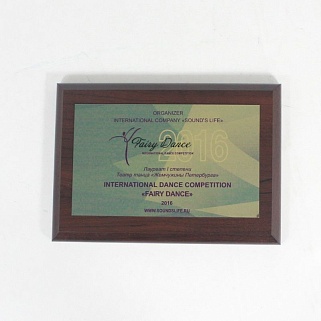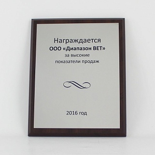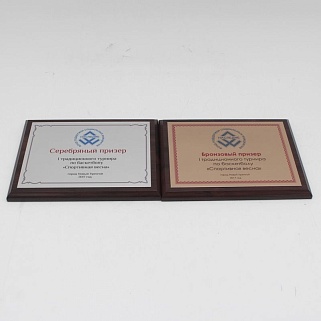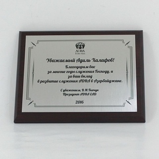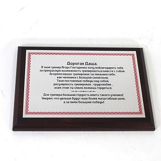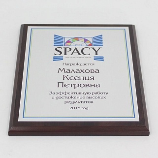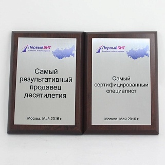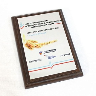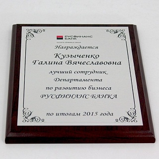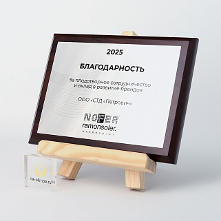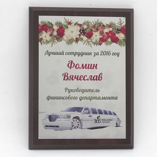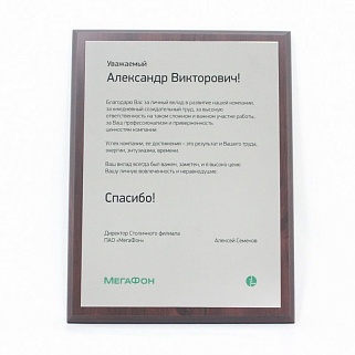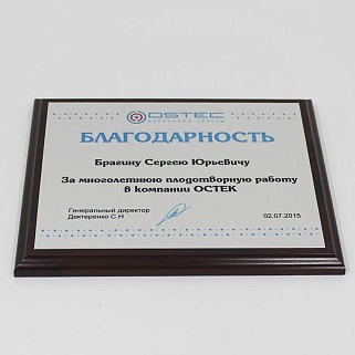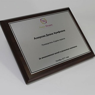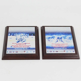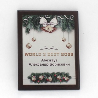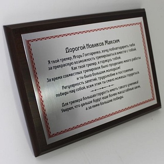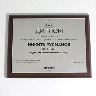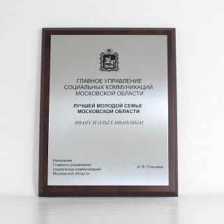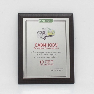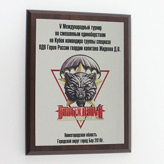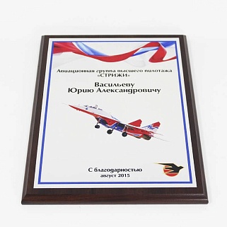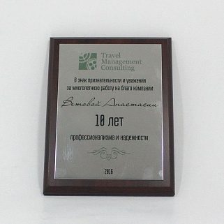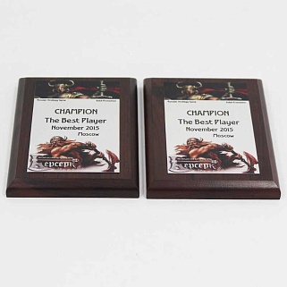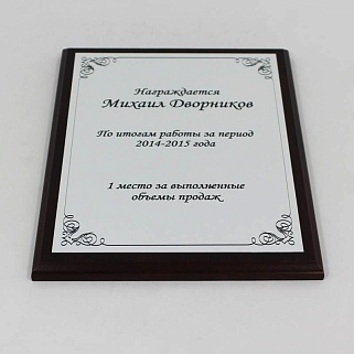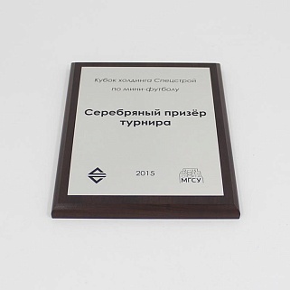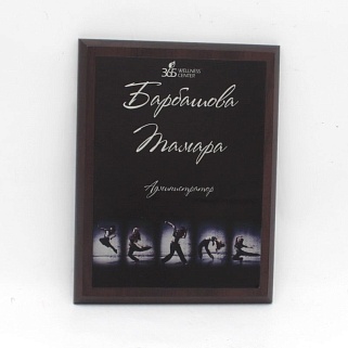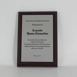 Плакетка из натурального дерева. В комплекте с металлической пластиной серебряного цвета. Полноцветное нанесение любого количества символов и изображений включено в стоимость.