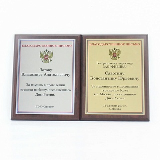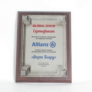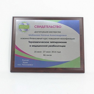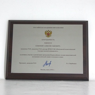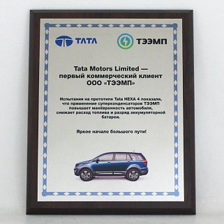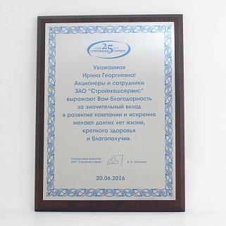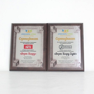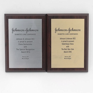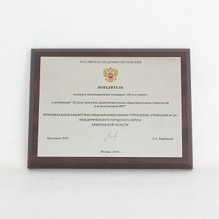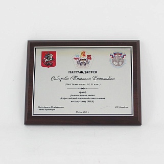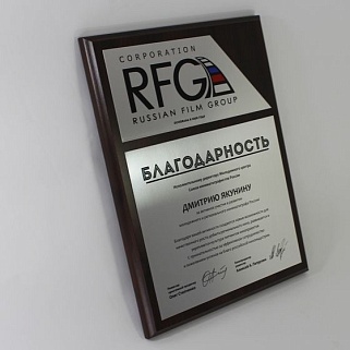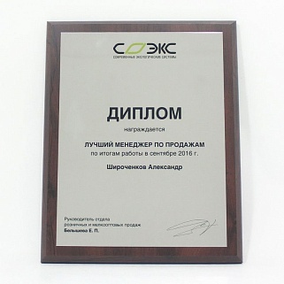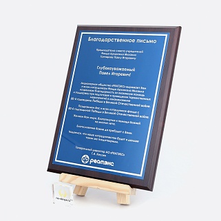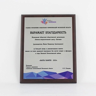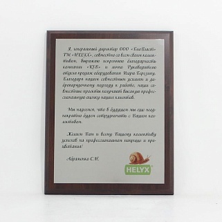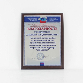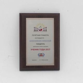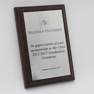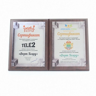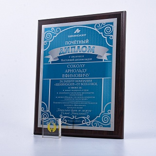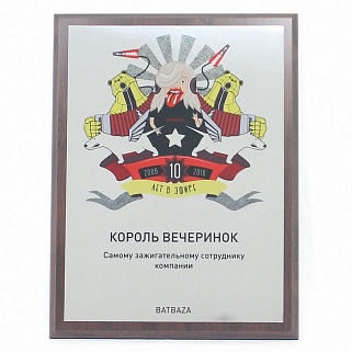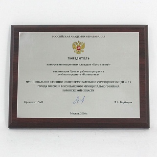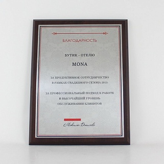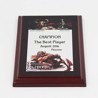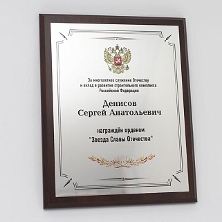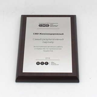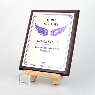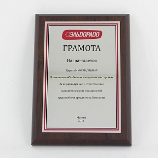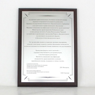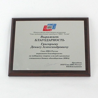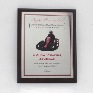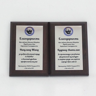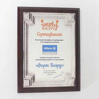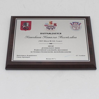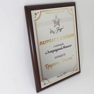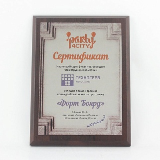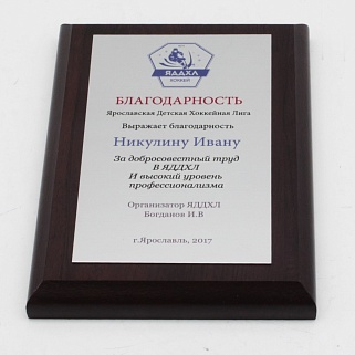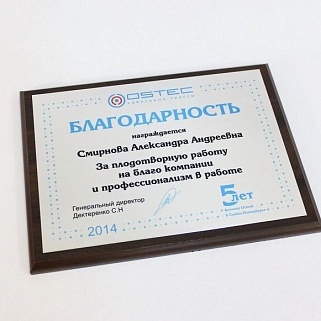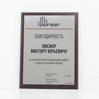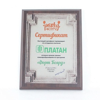 Плакетка из натурального дерева. В комплекте с металлической пластиной серебряного цвета. Полноцветное нанесение любого количества символов и изображений включено в стоимость.